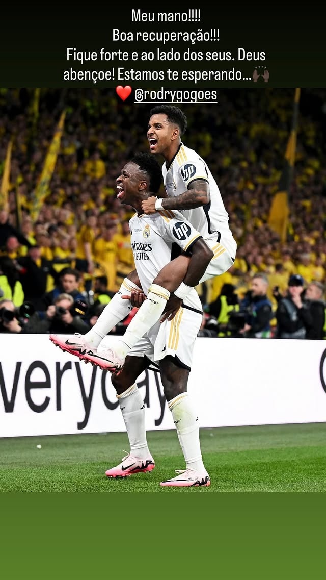 3月4日讯 皇马边锋罗德里戈遭遇重伤,由于右膝前十字韧带断裂并伴有外侧半月板断裂,他将伤缺约10个月时间。作为罗德里戈在俱乐部和巴西国家队的双料队友,维尼修斯送上了祝福。